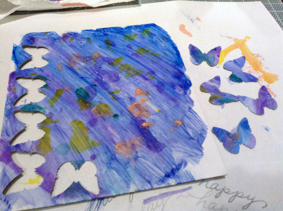 Then, I used my trusty butterfly punch to punch out as many shapes as I could out of that piece. Though I didn't use them all on my card, I'm sure they will come in handy for future projects. It looked a little like this.